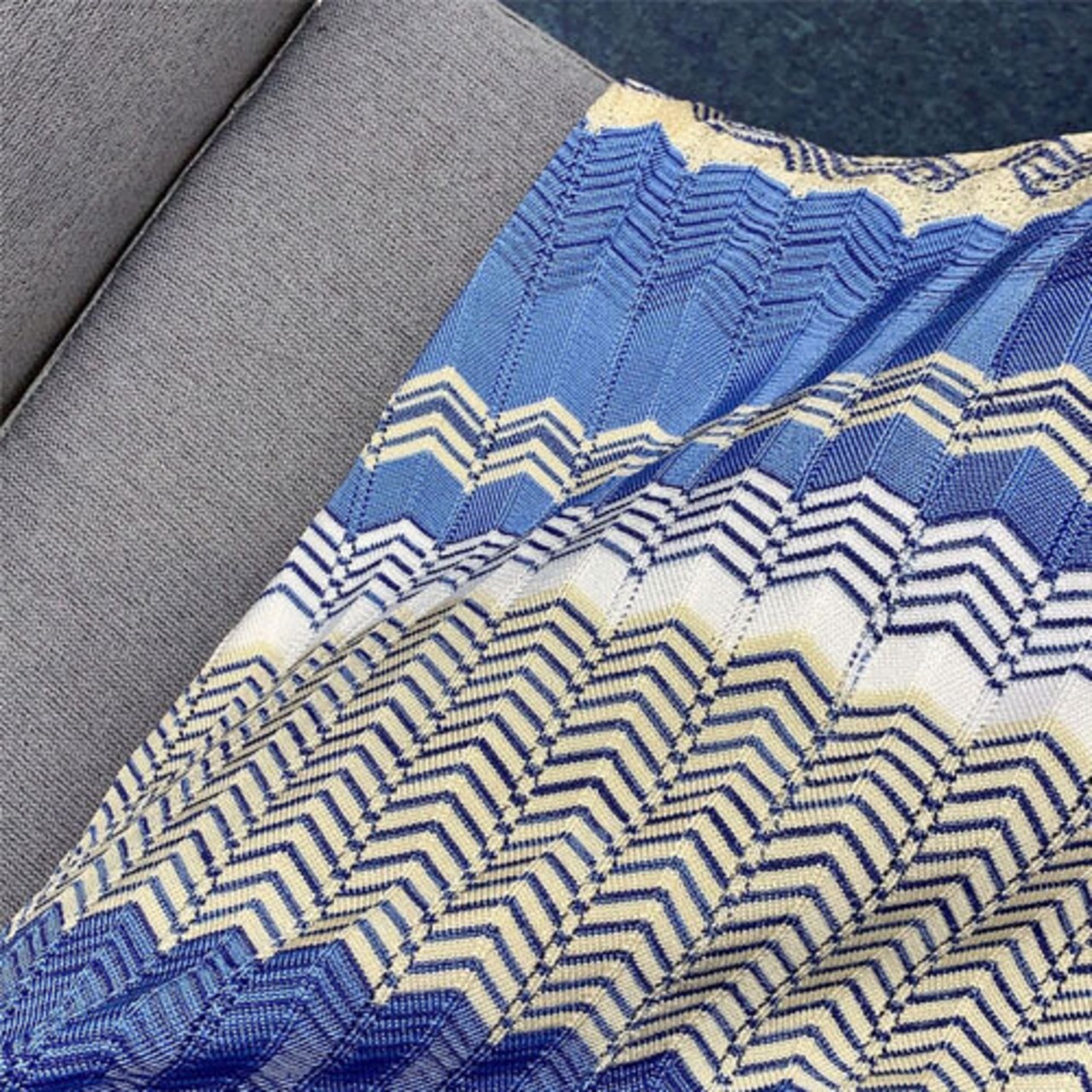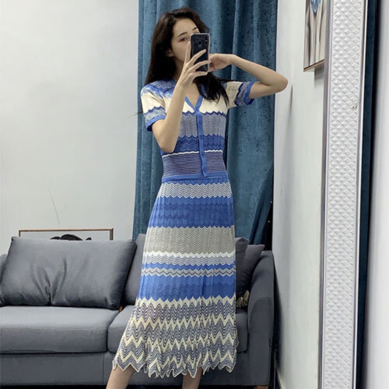 20代 30代 40代 秋 幾何学模様ニットセットアップ Vネックカーディガン&スカート ブルー RB-R3-BA04-SA08-0024
