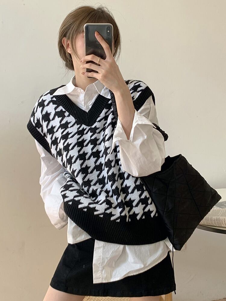 トップス 千鳥柄 ニット ベスト Vネック バイカラー ポイント RB-R3-09-BA07-NK-0006