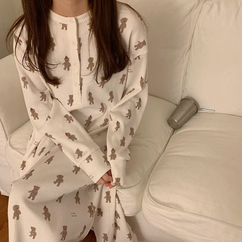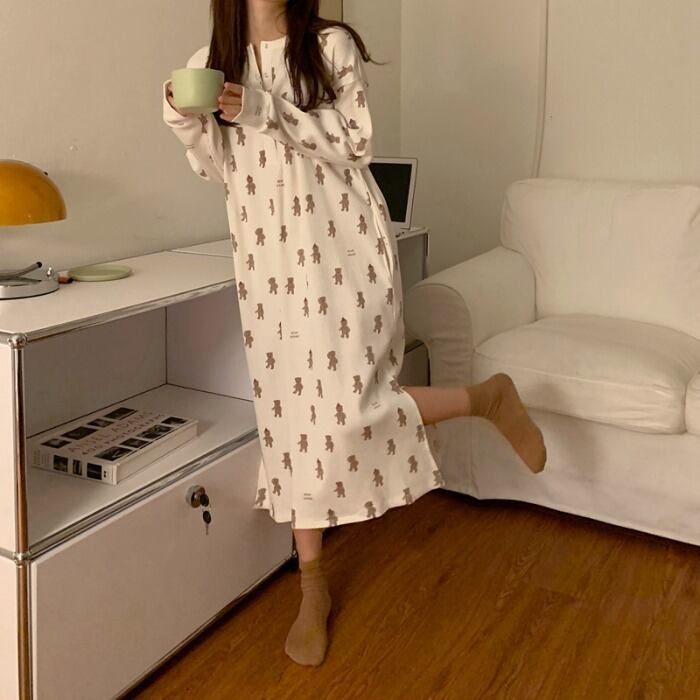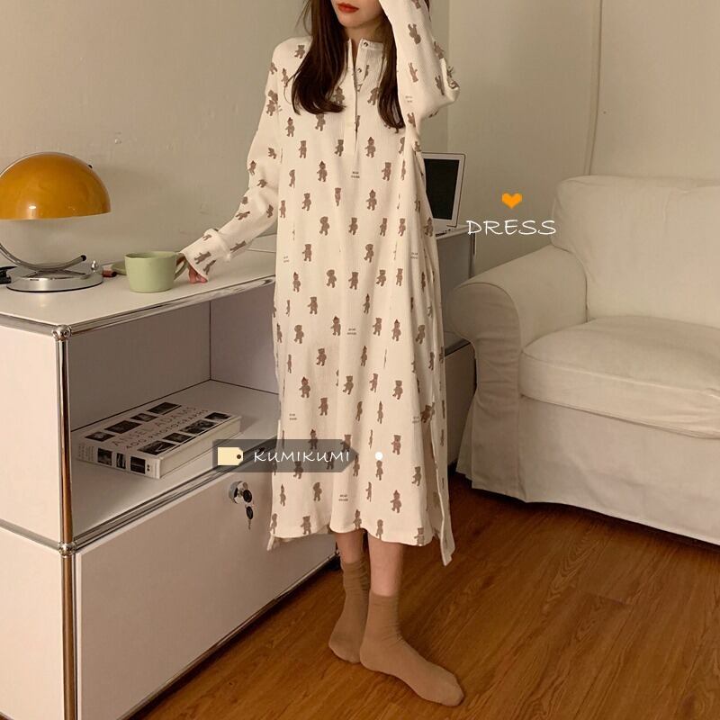 ワンピース 主婦 OL 韓国風 20代 30代 40代 ルームウェア ワンピースくまさん ゆったり ラウンドネック