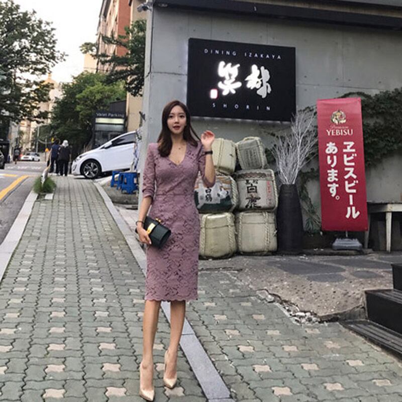 ワンピース 20代 30代 40代 秋 レースワンピース セクシー Vネック 長袖 S M L LL ピンク グレーブルー 韓国風 スリム 魅力的 RB-R3-09-BA21-CN-0028