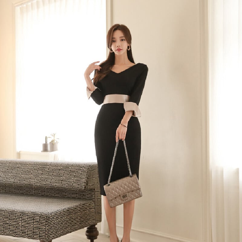 ワンピース 20代 30代 40代 秋 ワンピース 無地 OL/フォーマル Vネック 黒 長袖 ハイウエスト 高品質 レトロ ブラック RB-R3-09-BA21-CN-0042