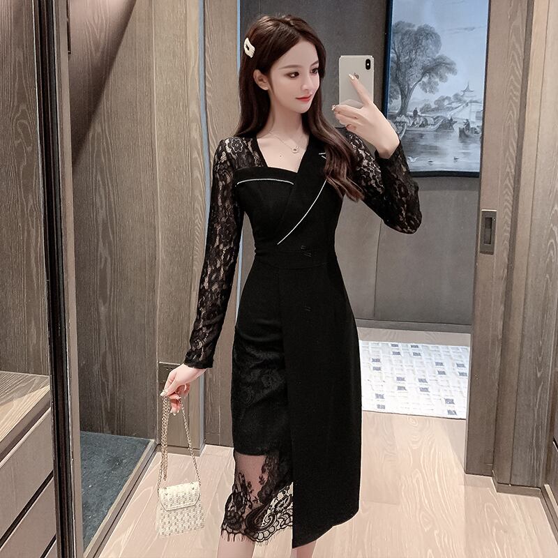 ワンピース 20代 30代 40代 秋 ワンピース セクシー レース エレガント 不規則 黒 一目惚れ 韓国系 透かし彫り 長袖 細見え 腹隠し ブラック RB-R3-09-BA21-CN-0045