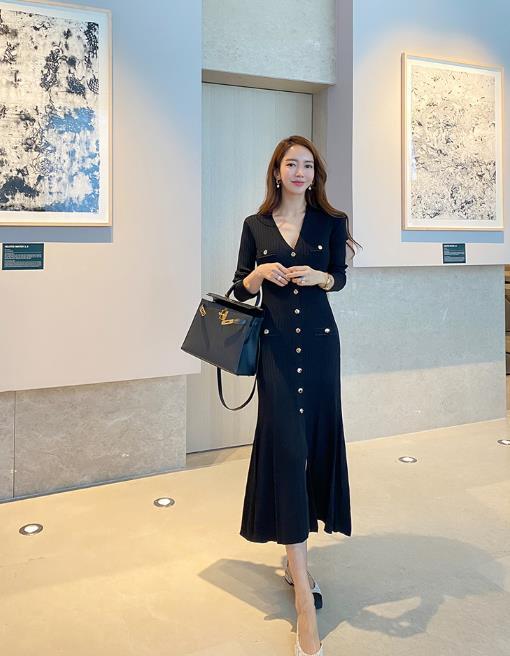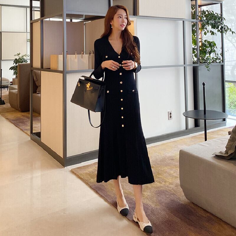 ワンピース 20代 30代 40代 秋 ワンピース ロング Vネック ニット 黒 女っぽさが漂う シンプル 無地 ブラック RB-R3-09-BA21-CN-0086