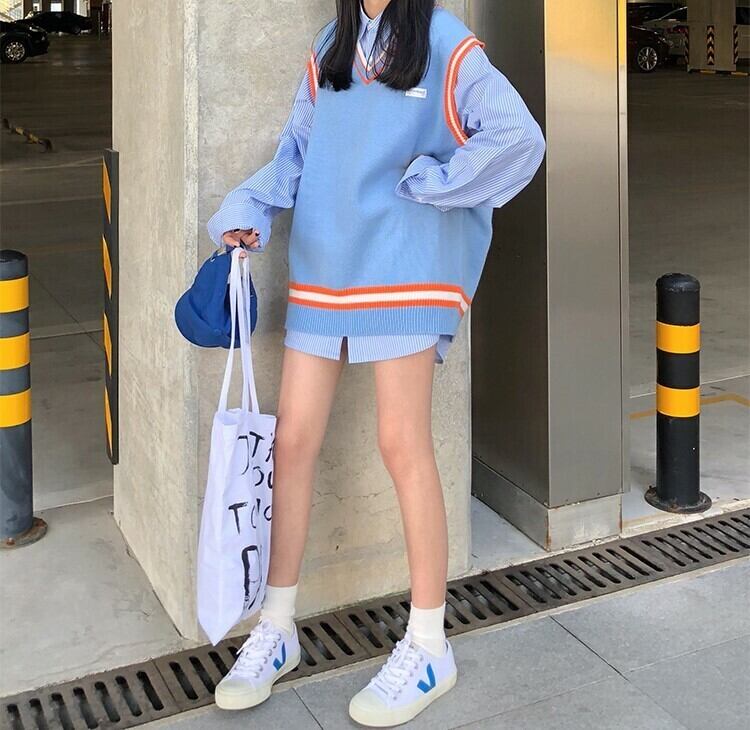 トップス 20代 30代 40代 秋トップス 青 紫 シャツ ベスト ゆったり ビッグシルエット オーバーサイズ ワンサイズ 学生風 コントラストカラー 原宿 ツーピース 2点セット 可愛い キュート オシャレ カジュアル お出かけ ランチ 買い物 ショッピング デート 春秋 長袖 RB-R3-09-BA24-CN-0025