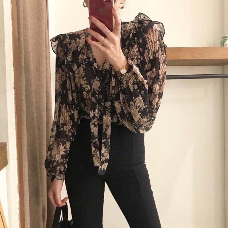 トップス 20代 30代 40代 秋 シフォンブラウス トップス ブラウス 長袖 リボンタイ レトロ 花柄 Vネック ランタンスリーブ 袖シャーリング デザインシャツ エレガント きれいめ フェミニン オフィス 通勤 通学 お出かけ デート 春 夏 秋 冬 ベージュ ブラック 20代 30代 40代 RB-R3-09-BA24-CN-0020