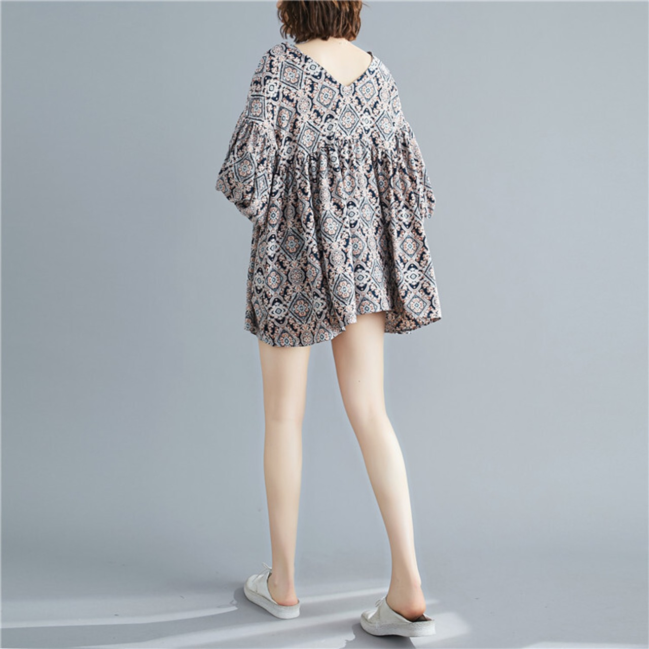トップス 20代 30代 40代 秋 総柄 エスニックプリント Vネック 袖ボリューム 半袖チュニック 新作 RB-R3-09-BA23-CN-0007