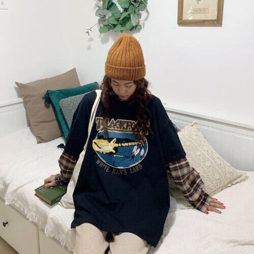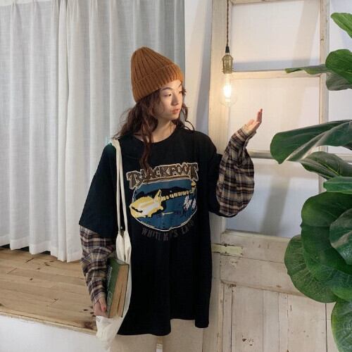 韓国風 トップス 20代 30代 40代 秋 森ガール カジュアル チェック柄 重ね風 プリント ゆったり ラウンドネック 長袖 Tシャツ トップス RB-R3-09-BA12-SA-0065
