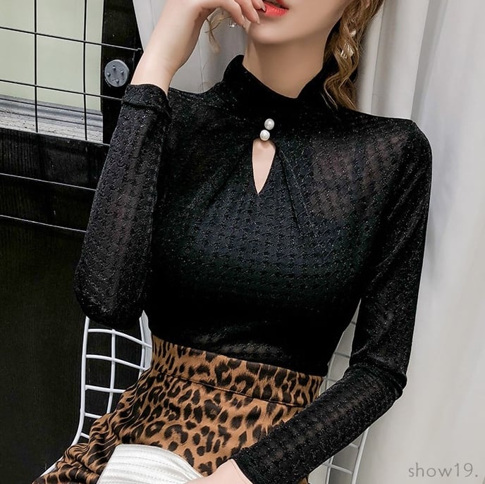 トップス 20代 30代 40代 秋 セクシーファッション透かし彫りハーフネック切り替えTシャツ RB-R3-09-BA30-CN-0003