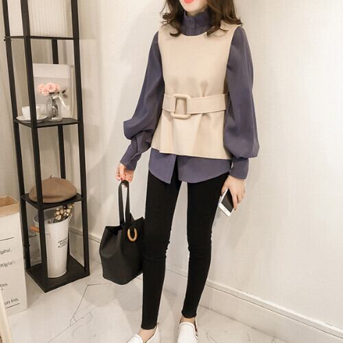 トップス 20代 30代 40代 秋 2点セット パフスリーブ シャツ+ベスト 韓国系 一目惚れ RB-R3-09-BA14-SA-0091