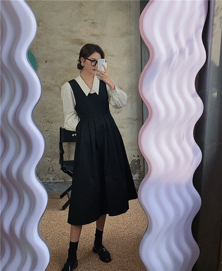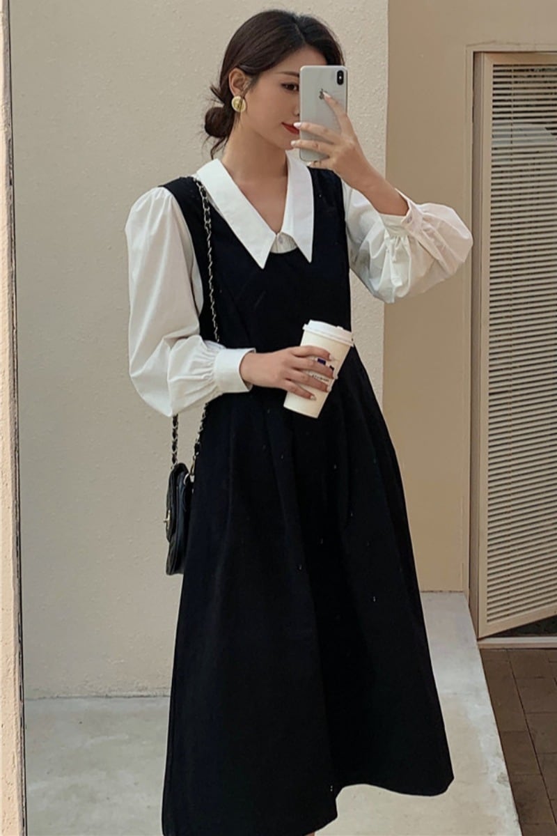 ワンピース 秋 新作ビックカラーシャツ&ブラックエプロンドレスRB-R3-09-BA16-NK-0032