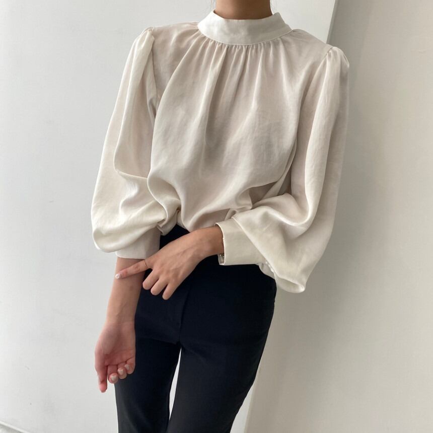 トップス 秋 プリーツ スタンド カラー無地 ボリューム スリーブ シアー ブラウスST2190