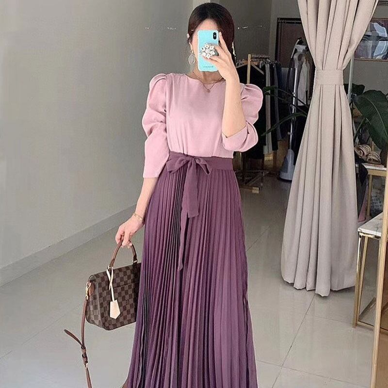 スカート 秋 ウエスト リボン プリーツ レースウエストバブル長袖RB-R3-09-BA18-NK0086