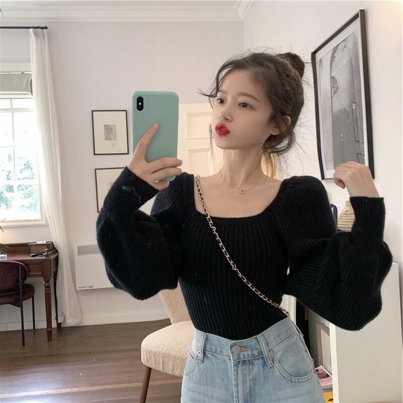 トップス 春と秋 バブルランタン スリーブ トップ ショート ルーズ ニット レディース セーターRB-R3-11-BA13-NK-0027