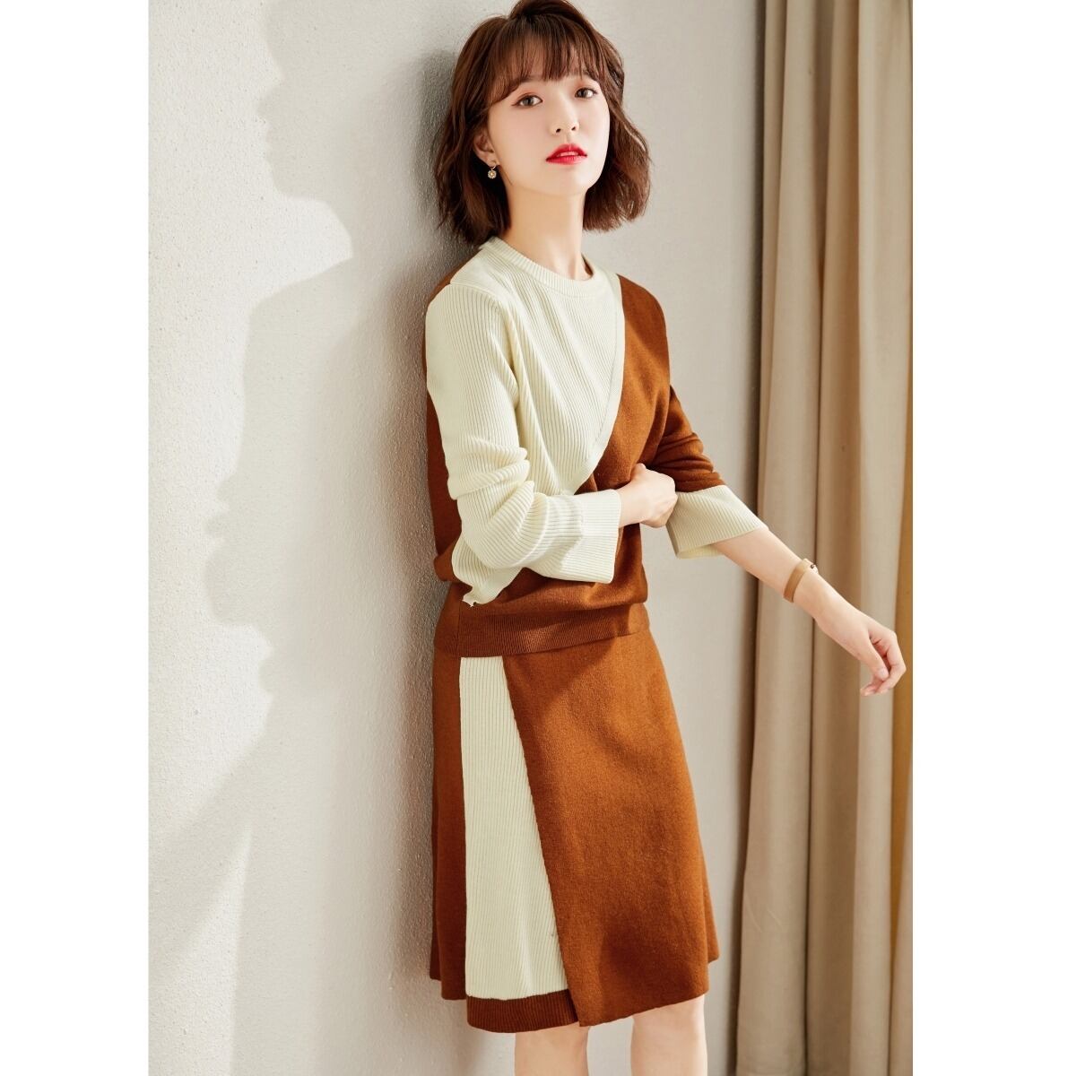 ニットセットアップ レディース 切り替え柄 セーターセットアップ 長袖 スカート 秋冬セーター セットアップ ニット レディース スカートセット ニットスカート カジュアル トップス 秋 ニット フォーマルRB-R3-11-RT01-NK-0050