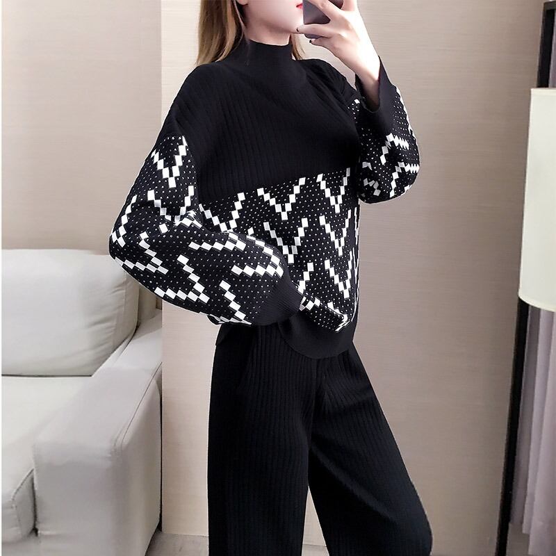 セットアップ カジュアル レディース ニットセットアップ セーター パンツ ニットパンツ ニットセーター レイヤード風 ゆったり 幾何柄RB-R3-11-RT01-NK-0057