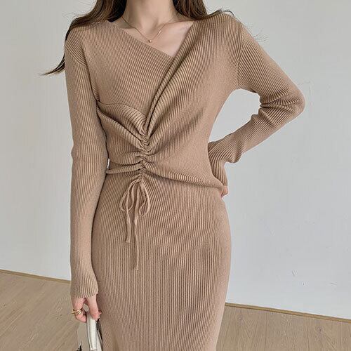 ギャザープリーツ Vネック ニット ワンピース レディース 秋冬物 スリム 薄手 カシュクール ロングセーター ハイウエスト ロング丈 RB-R4-01-BA-SA-0003