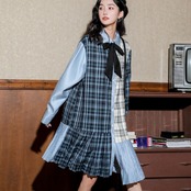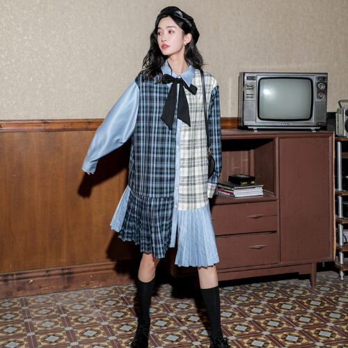 格子柄 プリーツ 秋冬物 ロング丈 薄手 長袖 シャツスカート ワンピース RB-R4-01-BA-SA-0016