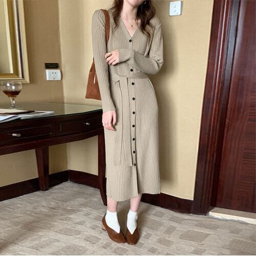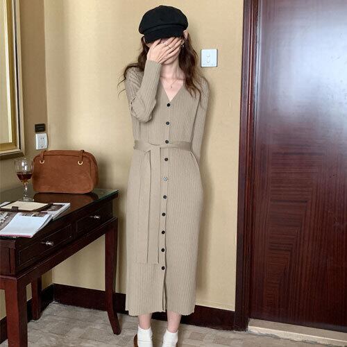 長袖 ニット ワンピース Vネック ストライプ ロング丈 韓国ファッション レディース オータム 冬物 スタイル RB-R4-01-BA-SA-0022