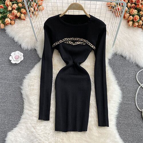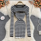 ツーピース セット 長袖 ニットトップス+セクシー ボディコン ストラップ ワンピース 女性チェーン レトロ ストライプ 秋冬 ニット ロング ウィンター 冬物 RB-R4-01-BA-SA-0036