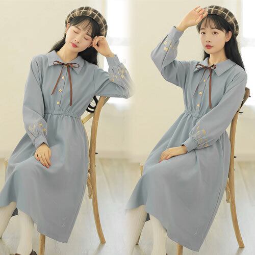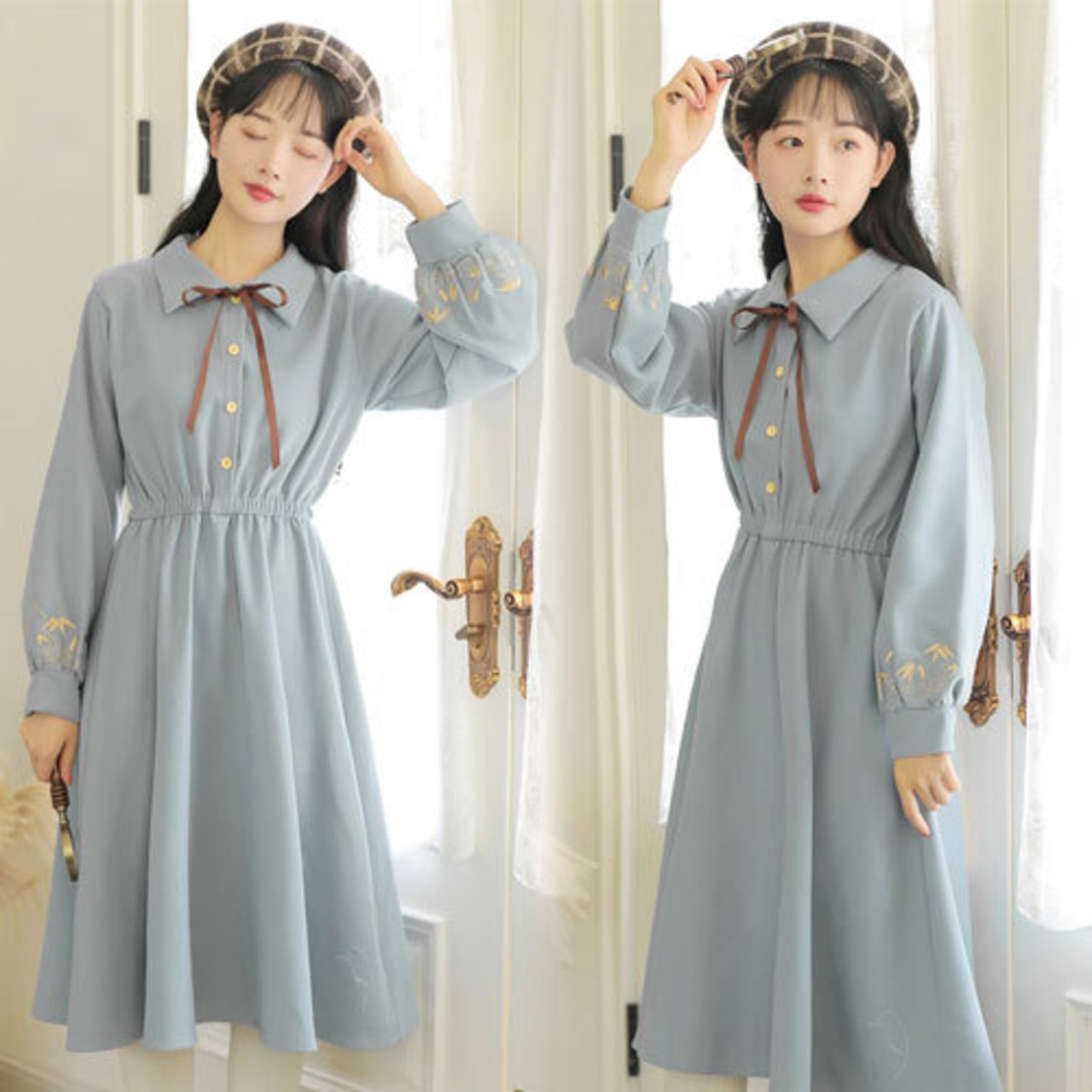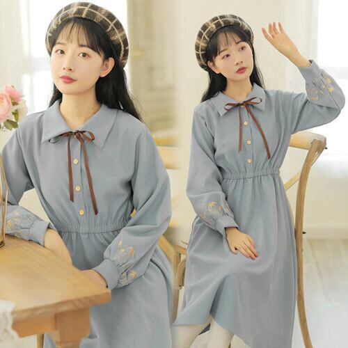 ワンピース 袖に刺繍入り 膝下丈 レトロ 可愛い 合わせやすい S M L LL 青 赤 RB-R4-01-BA-SA-0037