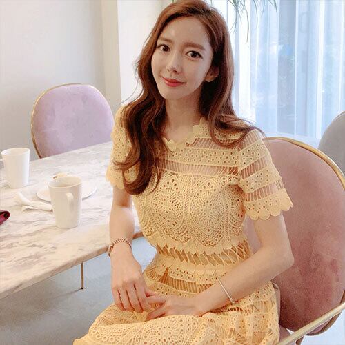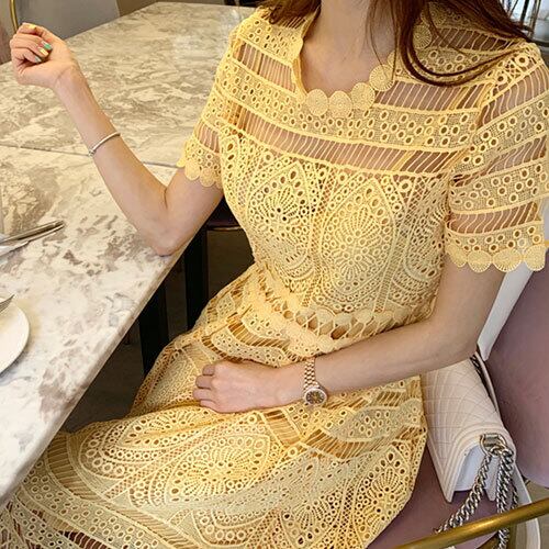 半袖 黄色 レース ロング丈 ワンピース ライトイエロー RB-R4-01-BA-SA-0065