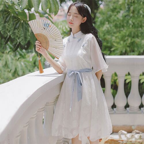 立ち襟 半袖 レトロ レース シフォン チャイナ ワンピース 膝丈 RB-R4-01-BA-SA-0072