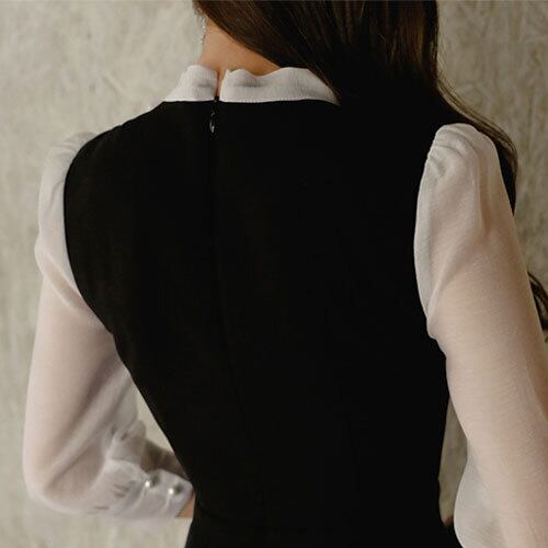 Uネック 七分袖 ハイウエスト 膝丈 首元 リボン ワンピース エレガント RB-R4-01-BA-SA-0077