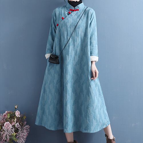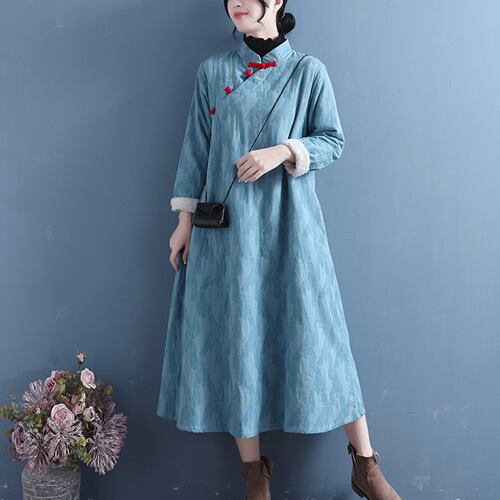 立ち襟 長袖 ロング丈 チャイナ風ワンピース 3color 裏起毛 厚て 暖か RB-R4-01-BA-SA-0083