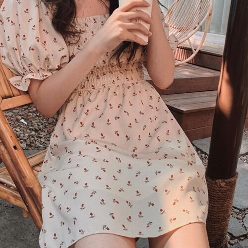 ワンピース 花柄 ハイウエスト スクエアネック フラワー ミニ丈 パフスリーブ ワンピース RB-R4-01-BA-SA-0090