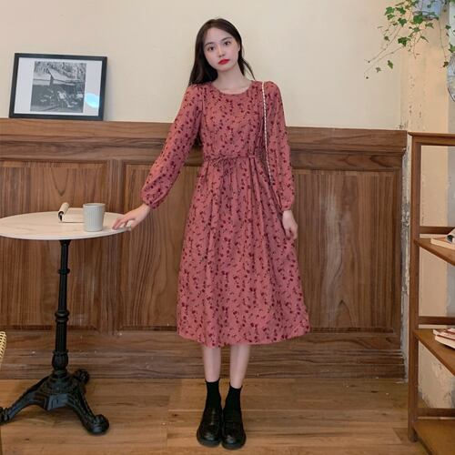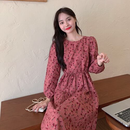 ワンピース Aライン ロング ラウンドネック レース 長袖スリーブ フローラル ヴィンテージドレス コーデュロイドレス ワンピース スプリング オータム レディース スウィート キュート カジュアル 大人ガーリー 春物 秋物 花柄 Oネック レースアップ ビンテージ RB-R4-01-BA-SA-0100