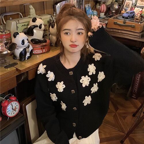 韓国ファッション 秋冬物 ラウンドネック Flowerデザイン ニットカーディガン ルーズ薄手 レディース ロング Oネック 長袖 RB-R4-01-BA-SA-0148