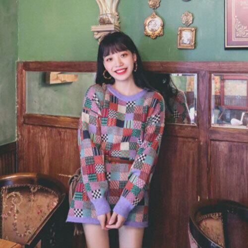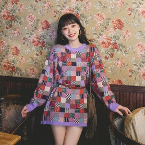 セーター ニットセーター スタンダードカラー ドレス ルーズ ショート スカート スクウェア ステッチ レトロ スプリング オータム 春物 秋物 パープル 延命家ファッション RB-R4-01-BA-SA-0179