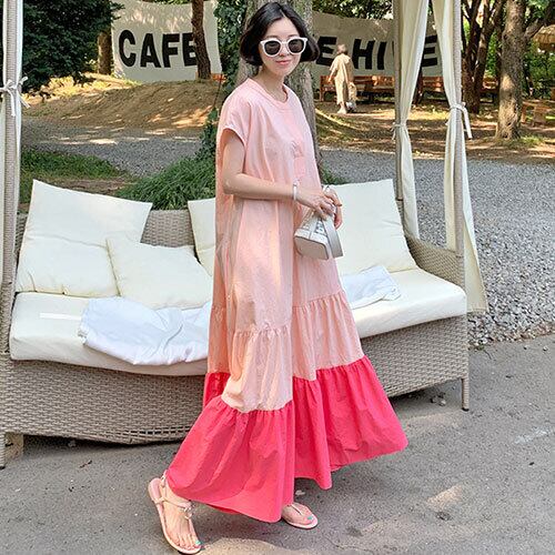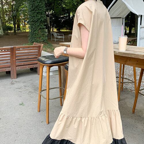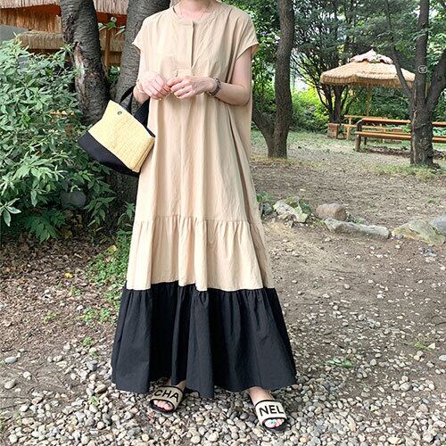 ノーカラー 春 スプリング ワンピース バイカラー マキシ丈 ゆったり ティアードワンピース カジュアル RB-R4-02-BY-SA-0008