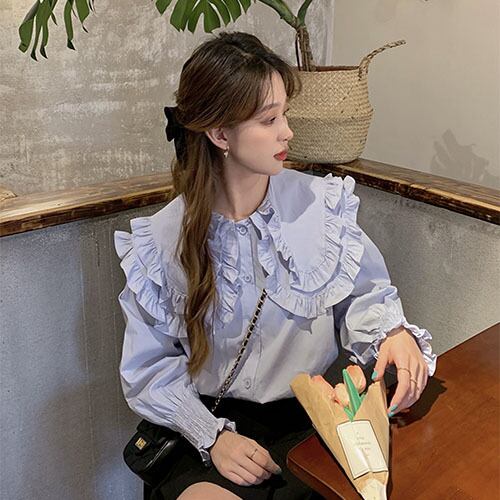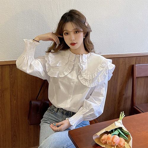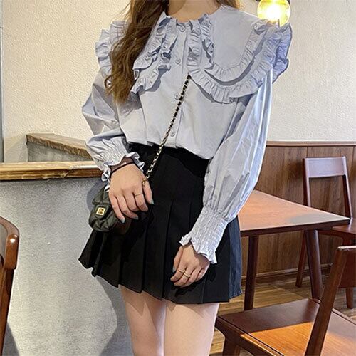 ノーカラー 春 スプリング 肩フリル ブラウス フェミニン 全2色 韓国 RB-R4-02-BY-SA-0039