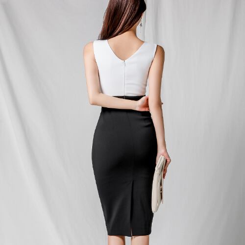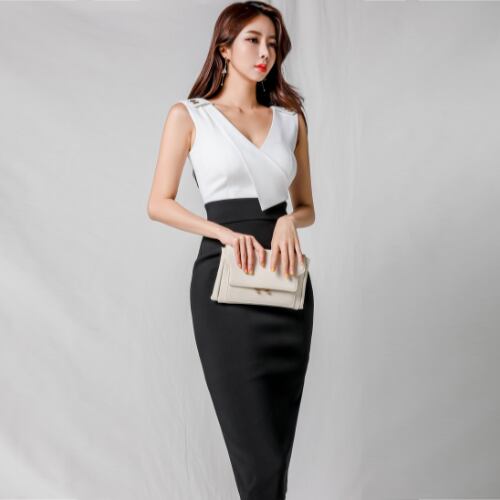ノーカラー 春 スプリング ワンピース アシンメトリー バイカラー Vネック ノースリーブ ワンピース RB-R4-02-BY-SA-0069