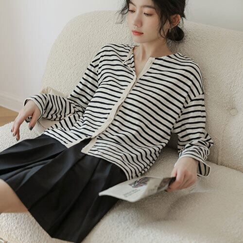 ノーカラー 春 スプリング ボーダー ボタン トップス 長袖 春夏 韓国 RB-R4-02-BY-SA-0077