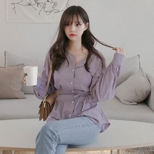ノーカラー 春 スプリング 大人可愛い ウエストリボンシャツ ブラウス 韓国 RB-R4-02-BY-SA-0080