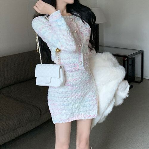 ノーカラー 春 スプリング セットアップ パステル ハイウエスト ツイード ミニ スカート カーディガン セットアップ 通勤 RB-R4-02-BY-SA-0098