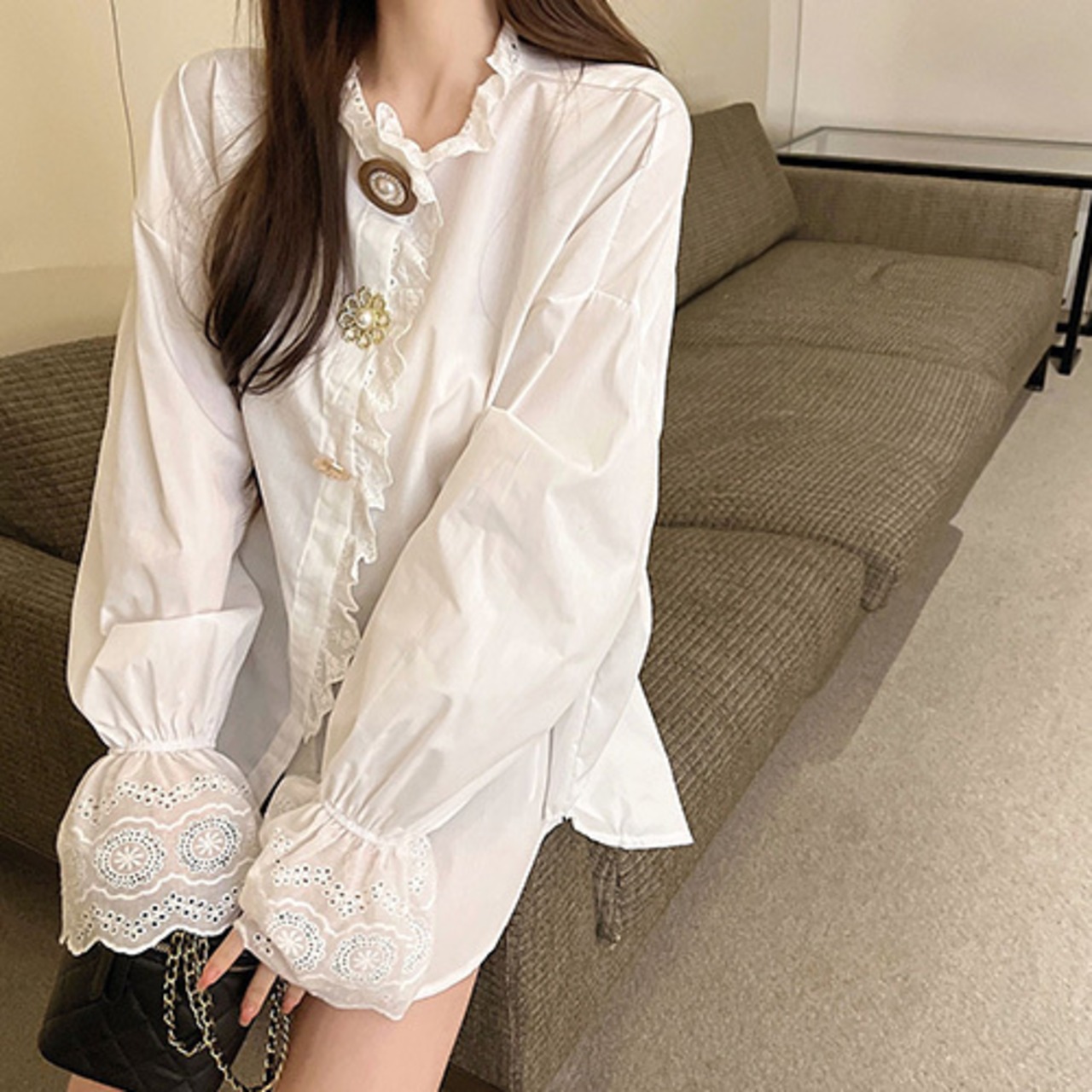 夏 サマー 長袖 ミニ フリル シャツ ワンピース チュニック 変わりボタン RB-R4-03-BY-SA-0062