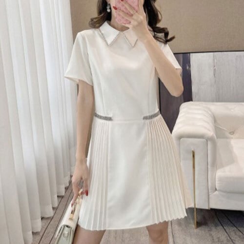 夏 サマー サイドプリーツ 襟付き ビジュー 半袖 上品 ミドル ワンピース RB-R4-03-BY-SA-0058