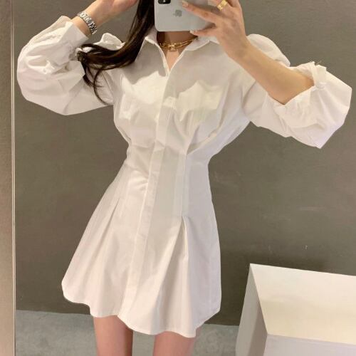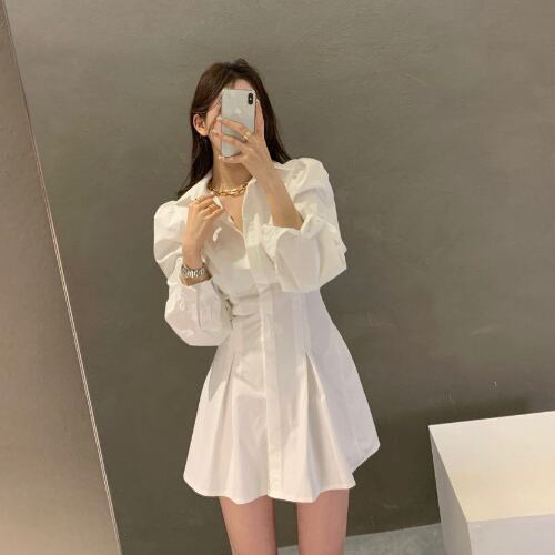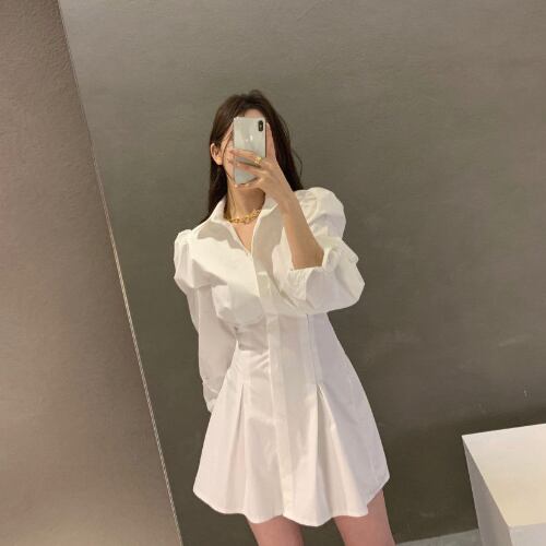 春 スプリング パフスリーブ ウエストシェイプ 長袖 ミニ A字スカート シャツ ワンピース RB-R4-03-BY-SA-0064