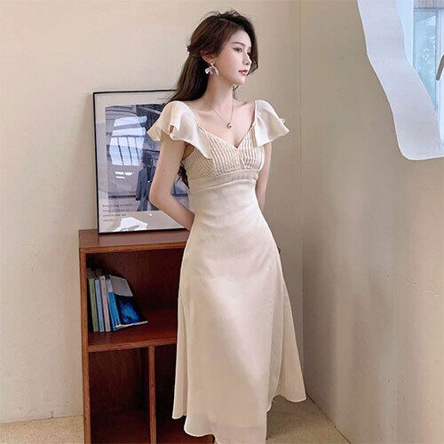 夏 サマー 半袖 フレア袖 Vネック ハイウエスト 上品 ミドル ワンピース RB-R4-03-BY-SA-0068