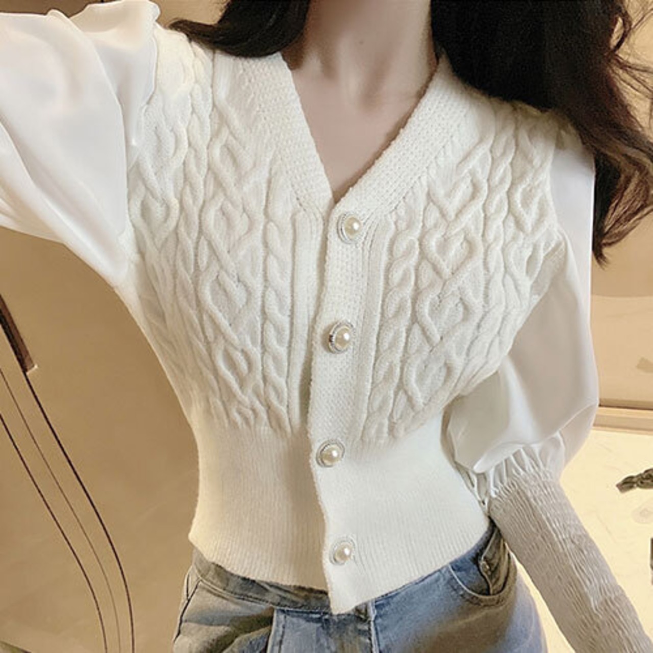 春 スプリング Vネック パールボタン 異素材 ショート カーディガン RB-R4-03-BY-SA-0082