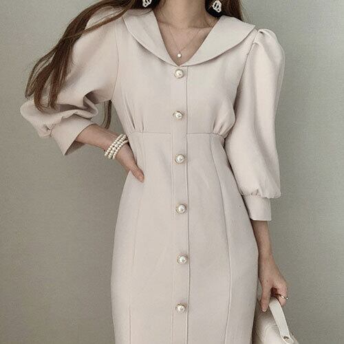 春 スプリング エレガント 襟付き ハイウエスト マーメイドワンピース パール S〜L 全2色 RB-R4-03-BY-SA-0124