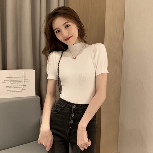 春 スプリング 細リブ リブニット タイト 半袖 プチハイネック トップス 全5色 RB-R4-03-BY-SA-0128