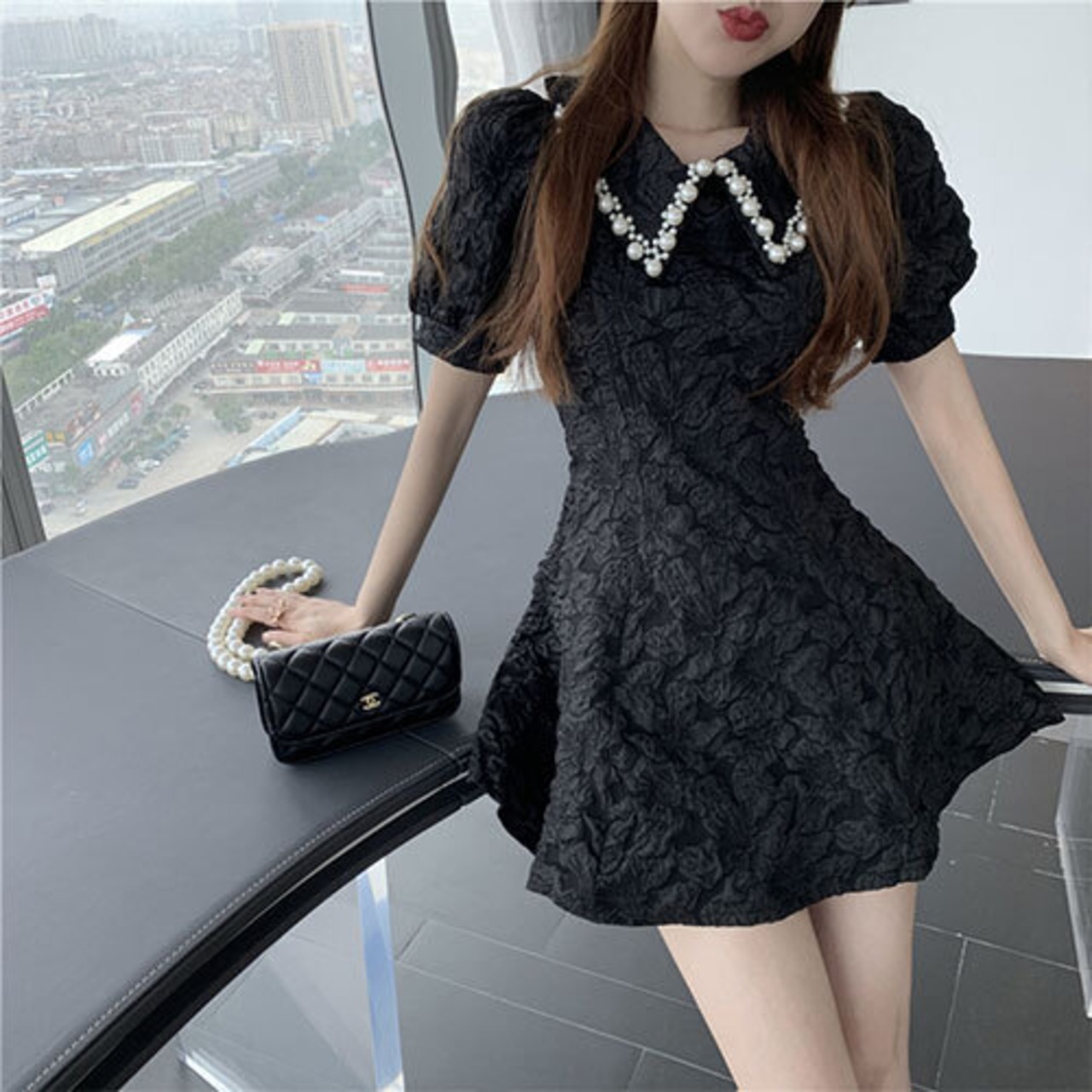 春 スプリング パール 襟付き パフスリーブ 細見え ミニ A字スカート ワンピース 全2色 S~L RB-R4-03-BY-SA-0133