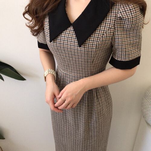 春 スプリング 襟付き Vネック半袖 チェック 秋 上品 ミドル ミディ ワンピース RB-R4-03-BY-SA-0136