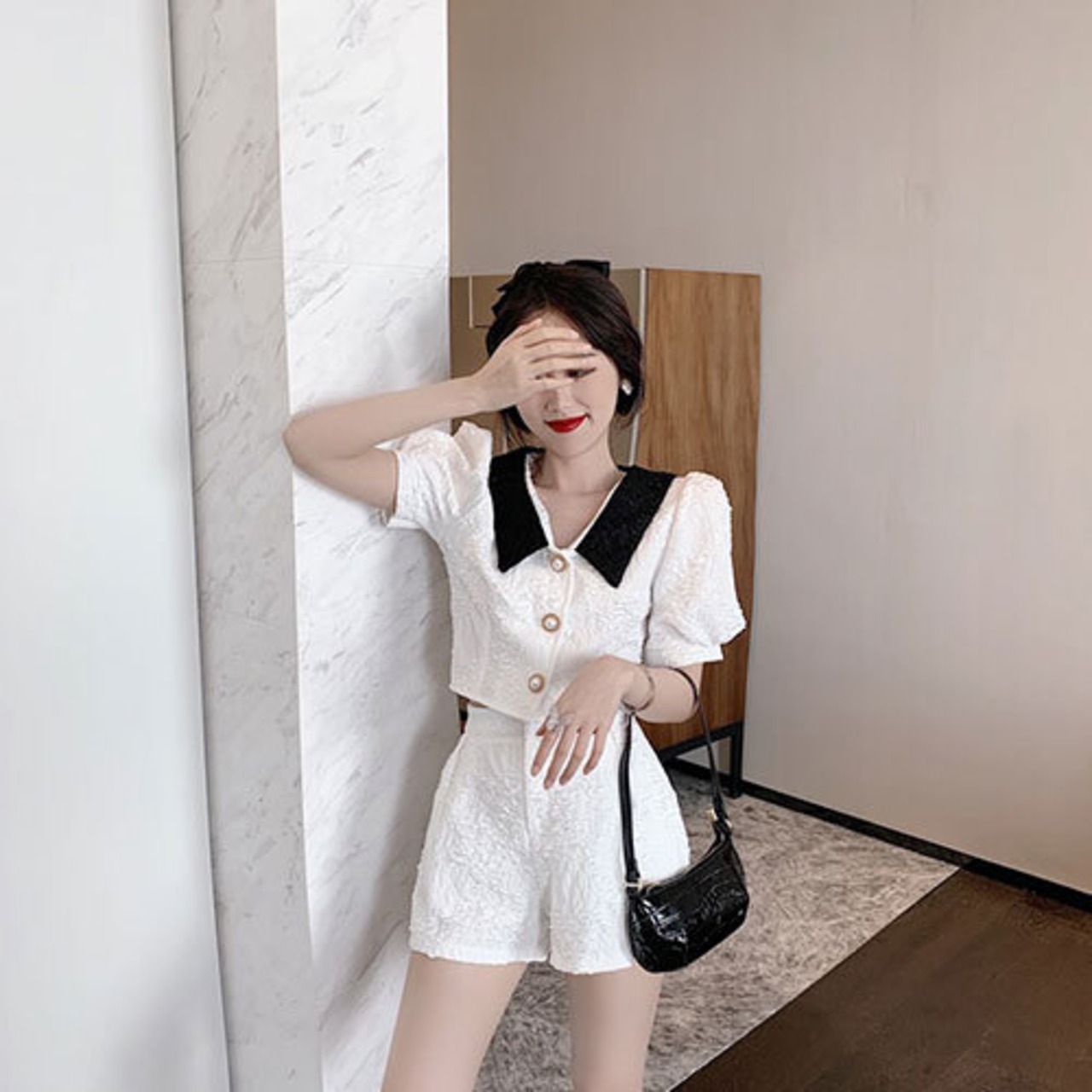 春 スプリング パフスリーブ ショートパンツ ハイウエスト 襟付き トップス セットアップ 全2色 S~L RB-R4-03-BY-SA-0146