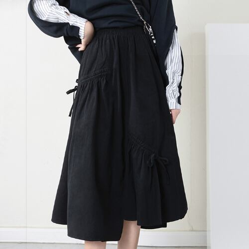 夏 サマー スカート サイドリボン シャーリング ギャザー フレア Aライン アシンメトリー ウエストゴム コットン ミドル丈 カジュアル RB-R4-05-BY-SA-011