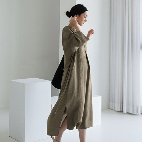 夏 サマー ワンピース チュニック オープンカラー ミモレ丈 長袖 リネン 麻混 シンプル スキッパー ウエストリボン RB-R4-05-BY-SA-019